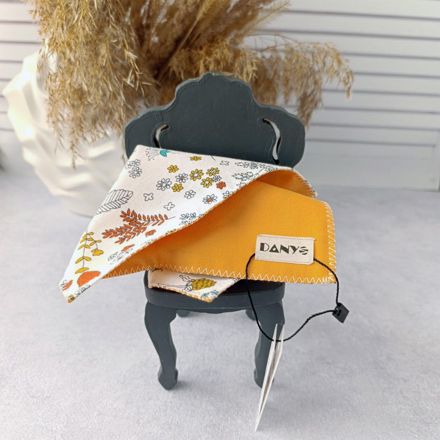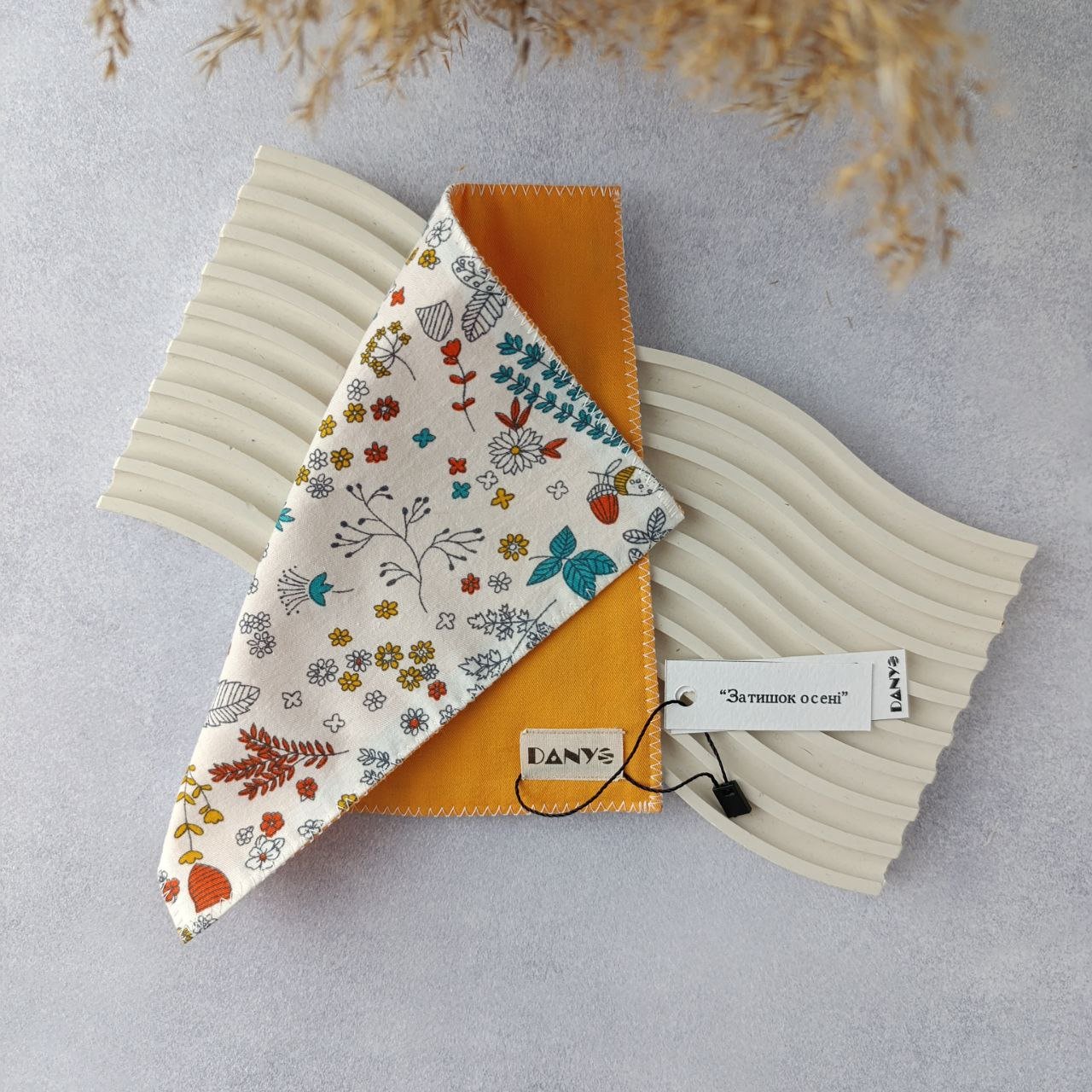 Хустинка “Затишок осені” – це гармонійне поєднання витонченості та практичності, створене, щоб доповнити ваш стильний образ. Цей аксесуар має дві унікальні сторони: Однотонна сторона – яскраво жовтого кольору  дарує радість. Біла сторона з легкими квітковими мотивами – зігріє осіннім настроєм. Жовті, оранжеві та бірюзові відтінки квітів дарують легкість і тепло, нагадуючи про барвисті миті золотої осені. Хустинка виконана з приємної на дотик тканини, яка делікатно дбає про вашу шкіру. Вона ідеально підходить для використання у повсякденному житті або як стильний акцент у вашому образі. Це більше, ніж просто аксесуар – це ваша маленька осіння мрія, яку можна взяти із собою…